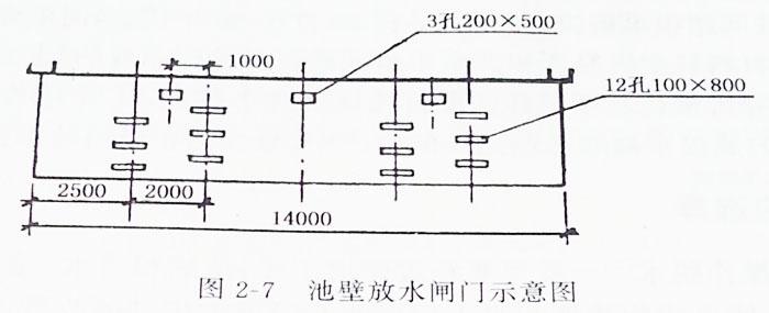 進(jìn)灰水渠道斷面為50cm×70cm,總長(zhǎng)200m。池壁放水閘門(圖2-7)由標(biāo)高0.3m開始,每隔0.2m設(shè)兩個(gè)0.1m×0.8m的排水孔,及標(biāo)高0.5m、0.7m、0.9m、1.1m和1.3m處各設(shè)兩個(gè)。標(biāo)高1.5m處設(shè)三個(gè)0.2m×0.5m的排水孔。排水管道190m,井點(diǎn)抽水設(shè)備兩套。