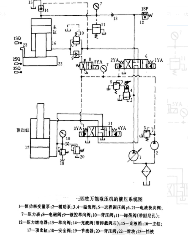 5、最后主缸停止時(shí)的狀態(tài) ,當(dāng)主缸滑塊上的鐵23按下沖程開關(guān)1SQ時(shí),電磁鐵2YA被切斷,主缸活塞被位于M功能中心的閥門6鎖定,停止運(yùn)動,返回行程結(jié)束。此時(shí),泵1油通過閥門6,閥門21返回油箱,泵處于卸載狀態(tài)。在實(shí)際使用中,主汽缸可以在任何時(shí)候停下來。